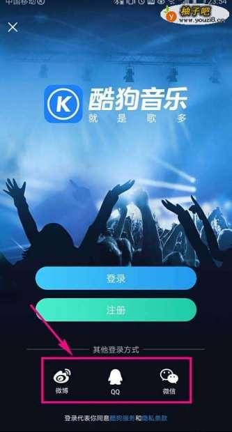 3这时便进入到了登录页面,如果你之前并没有注册酷狗账号的话,那么可以按照提示注册;如果觉得注册太麻烦的话,可以点击图示位置三种方式中的任意一种进行授权登录。