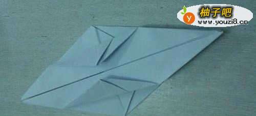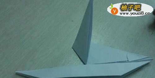 7将第六步折成后的图形第一层对折,反面也对折。把其中一个梯形在中部向上折成反谷形,展开折痕内翻成鸭脖子状。在鸭脖上端,向下折成谷形,内翻成鸭头。把船身展开,鸭身弄挺。鸭子船就成了。