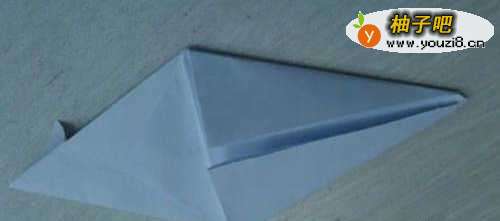 4把第三步中的正方形上面层两边沿折痕折叠,再将另一端的三角形折回。打开三角形折痕,将上面折叠层中内层拉出,沿三角形折痕压平。