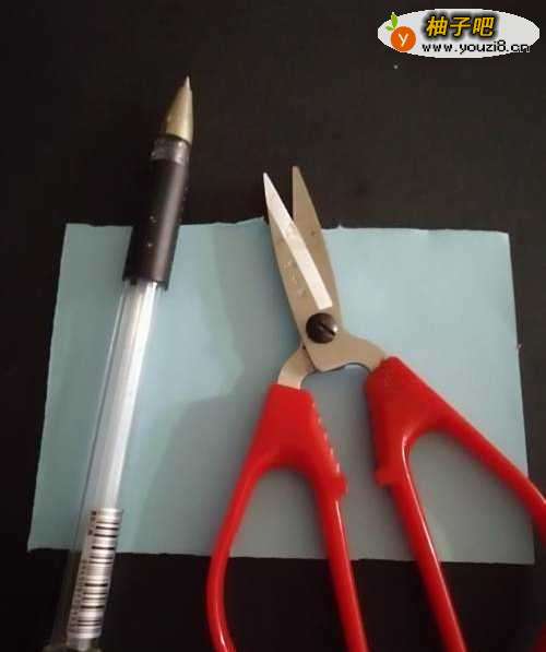 第一步,先把需要使用的工具准备出来,一张纸,一支笔,一把剪刀。