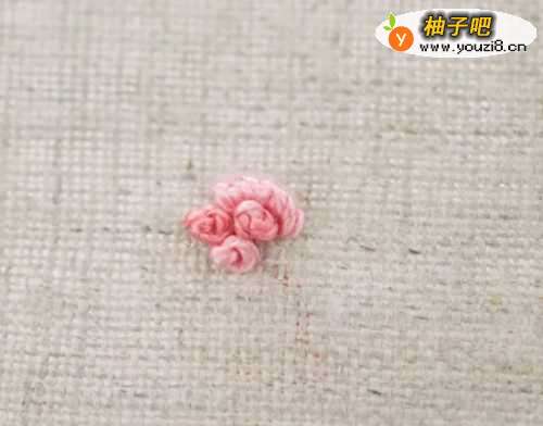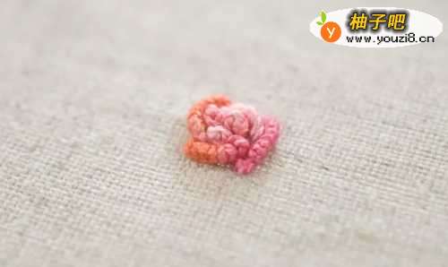 3开始玫瑰,刺绣中心的花。如图所示,你可以缝制一小束法国结,也可以用类似于缎子的针法把几个小的直缝缝合在一起。把针头靠近中间的一组,形成一个金条结,绕着中间的一部分。