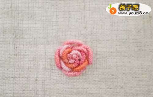 4继续玫瑰,加入更多的金黄结“花瓣”。与其让每一针的末端与前一针的末端相交,不如稍微重叠一下。随着花的生长,你的缝线也应该增加。把针头裹得更长,但也要试着给针缝更多的曲线。