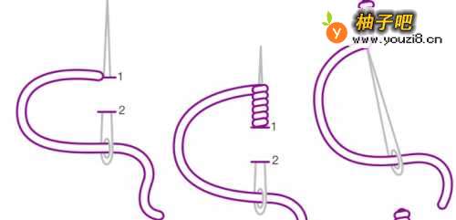 在你做金银玫瑰之前,一定要知道怎么做金条结。要想做好金条结,就把针头放在结的顶端(第1点)。把刺绣线包在针尖上。