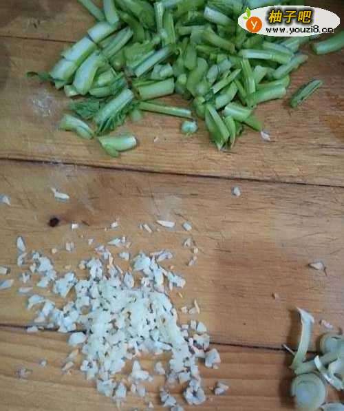 2将芥蓝的梗切成寸段,蒜切成末,葱切成小片。