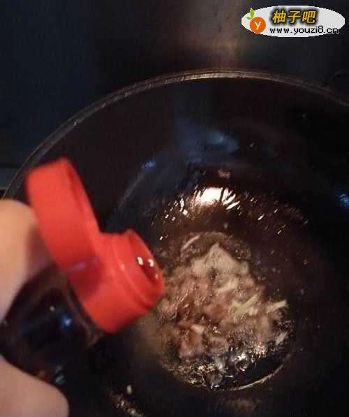 5在锅中放入适量的酱油,增加肉末的香味。