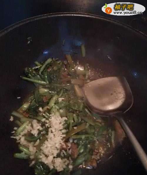 9将蒜末倒入锅中,和芥蓝一起翻炒均匀。