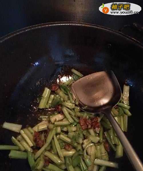 6将芥蓝的梗先放入锅中,用铲子翻炒均匀。