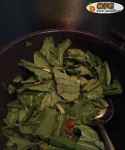 7梗炒一会儿后,将芥蓝的叶子也放入锅中一起炒。