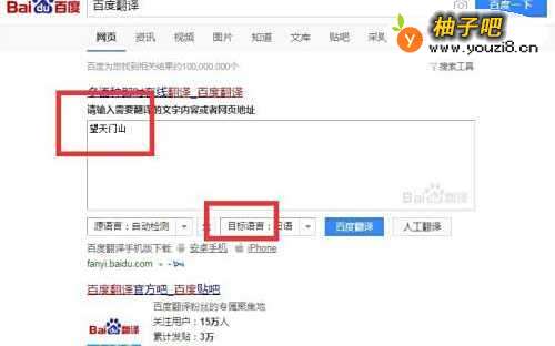 4此时我们在网页的第一项找到百度翻译,输入“望天门山”,如图
