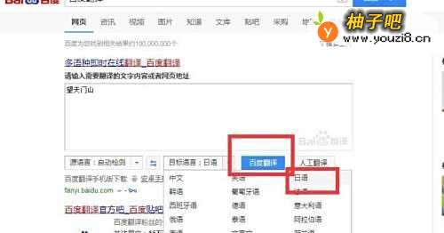 5然后点击“目标语言”,选择“日语”,接着点击“百度翻译”,如图