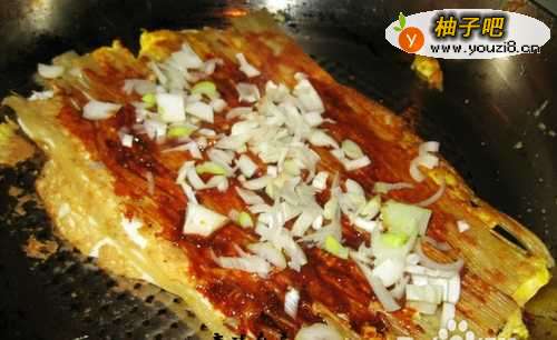 5为了更具有烧烤风味可以在冷面上撒点孜然和咖喱粉。然后抹上蒜蓉辣酱,撒上葱花。其实还应该撒一些香菜末,但是我家今天没香菜了,而且儿子也不爱吃香菜,每次吃烤冷面都要把香菜挑出来。^_^