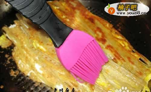 4这时候要在冷面上刷点水和醋,是为了防止煎出来的冷干硬。