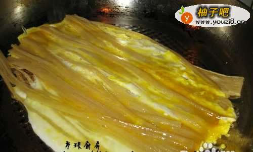 2平底锅刷少许油,烧热,然后把冷面扑上去,取一个鸡蛋,搅匀,然后洒在冷面上。