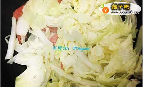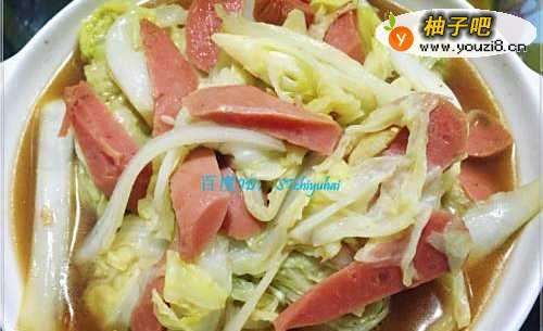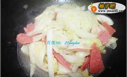 7将调味料炒匀,改付然后稍微焖炖一会,夹出少许试试味道,合适后就可以装盘了,侵此绵一盘美味的白菜火腿就做好了。