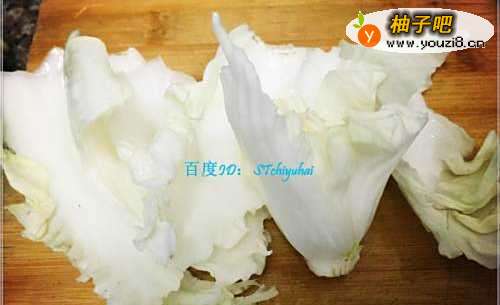 2将白菜叶和白菜杆分开,然后将杆沿着竖直方向切成丝条状备用。
