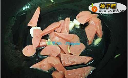5先放入火腿片翻炒一会,控制油温不宜过高,然后再倒入前面切好的白菜杆,混合炒一会。