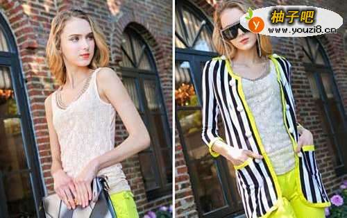 55、蕾丝吊带背心+黑白条纹修身外套:在春季搭配中,娇嫩柔美的杏色让人眼前一亮,大热的蕾丝元素,继续闪耀,尽情展现性感美妙的身姿,搭配上经典斑马条纹修身外套,个性鲜明,碰撞出独特的视觉效果。(以上搭配均来自美丽衣橱时尚女装)