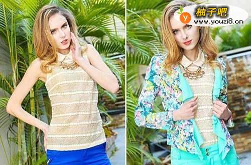 22、蕾丝雪纺衫+印花开衫:在春季的时尚舞台中,无袖设计师时尚宠儿的选择,能自由随性,优雅而百搭同时大大提升生活的时尚指数。搭配上印花开衫简洁而修身,将柔美融入其中,更显知性优雅,完美展示女性的柔美。(搭配均来自美丽衣橱时尚女装)