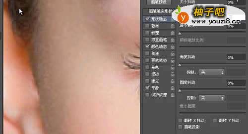 5打开画笔预设面板,在形状动态里面,将大小抖动设置为0%,控制选项为浙隐,因为眼睫毛是属于尖状的