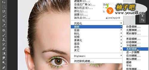 7缩小图片之后,我们才发现我们给人物画上去的眼睫毛比较生硬,如果我们要改变人物生硬的眼睫毛的话,我们就点击滤镜-选择模糊-高斯模糊,将模糊数据改为:0.9像素,然后点击确定