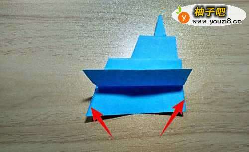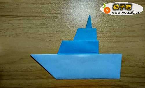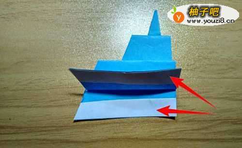 20把它粘贴在轮船底层两个空的位置(步骤7),并使得第1折痕下面都在里面,这样轮船就制作完成了。