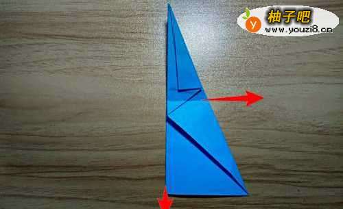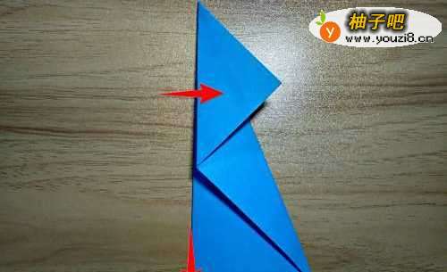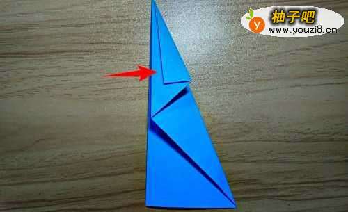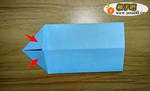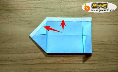 4翻到反面,在左侧两角分别折向折痕,分别为一个三角形。