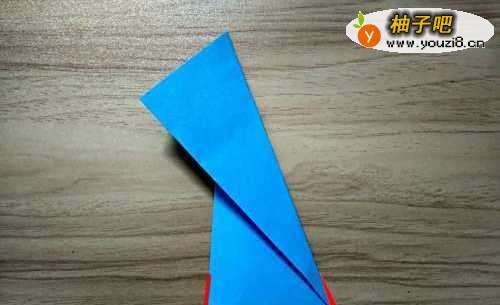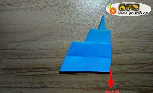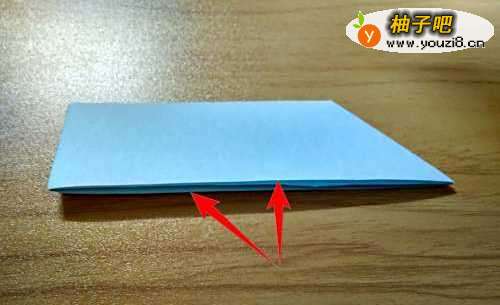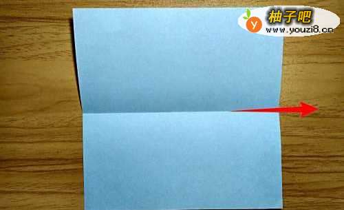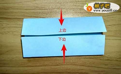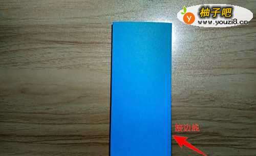 2拿起浅蓝色彩纸,上边对折到下边后摊开,有1条折痕。