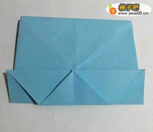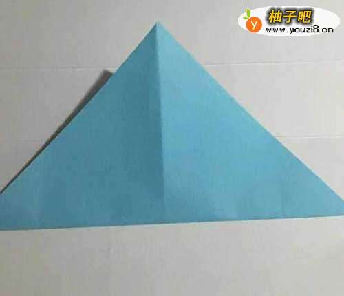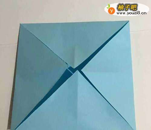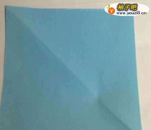 第一步 把一张16厘米X16厘米的正方形蓝色彩纸 从下向上对角折叠 然后把另一条对角线也对折一次 再把两条对边线也折叠一遍