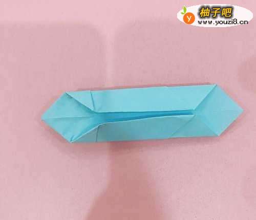 4再接着按照步骤3的过程,按照折印向内侧凹进去,再沿着中间的折印折叠1/2,正反都重复一次,如图4所示。