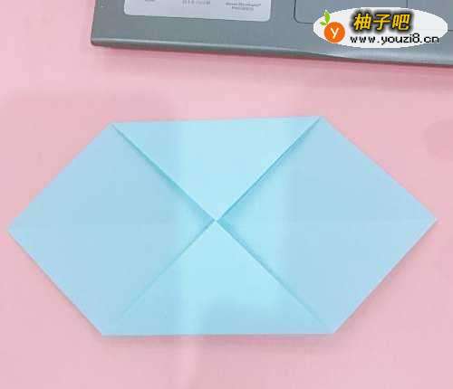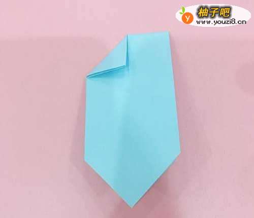 首先,将准备好的折纸先斜着对折一次,接着将其展开,然后沿着中间的折印折叠1/2,如图4所示。