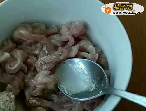 2猪肉切丝,加胡椒粉、料酒搅拌均匀腌制一会儿