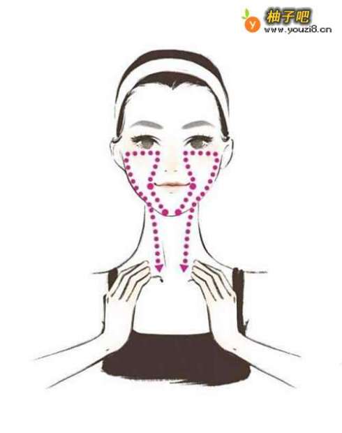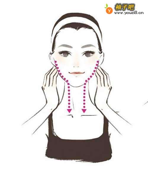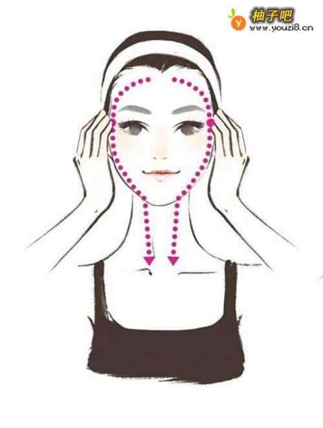 2从额头中间向两侧推至太阳穴,延续至脸颊两侧直至锁骨处,重复三次。