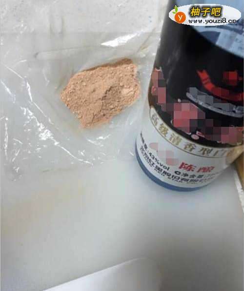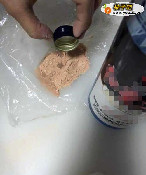 2打开白酒瓶盖,在瓶盖中倒入少量白酒,然后均匀地倒在粉饼沫上。