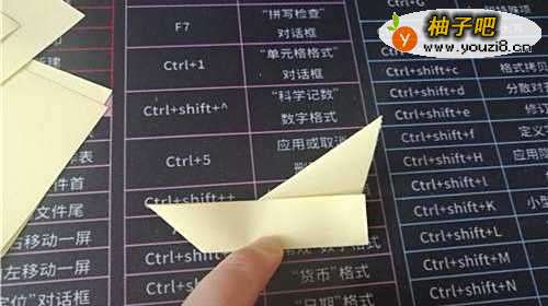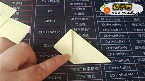 3把下侧的边上折,如图一。然后打开彩纸,如图二。