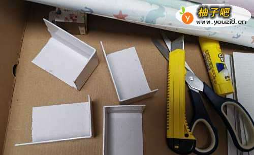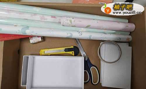 准备所用材料:不用的盒子(手机盒)、剪刀、裁纸刀、双面胶、签字笔、直尺、喜欢的彩纸,如图