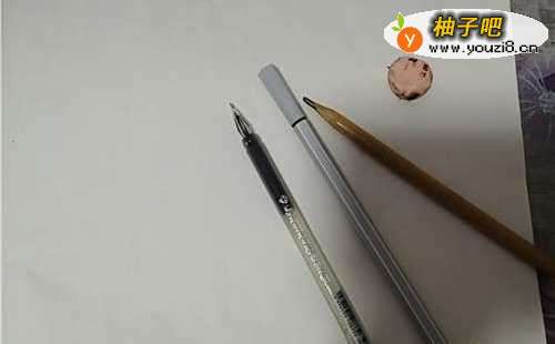 首先准备好一张纸,一支铅笔,一块橡皮,一只黑笔,一只水彩笔等备用。