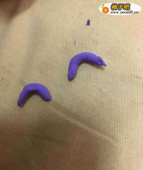 4在拿出紫色的彩泥揉成两个弯弯的眉毛粘到眼睛上面。