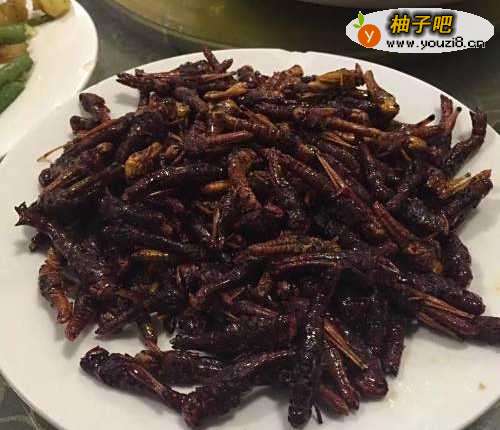 2油炸蚂蚱,据说蛋白含量很高,很有营养,就看大家敢不敢吃了。