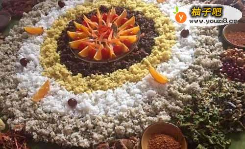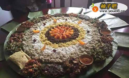 云南傣族的手抓饭,将米饭和菜围成一个圆形,然后趁热用手抓来吃,很有特色哦。