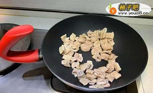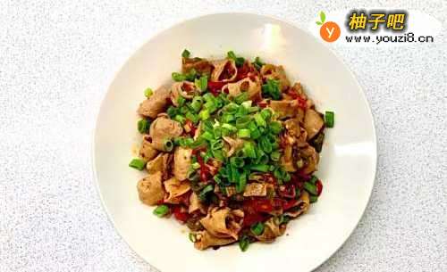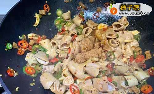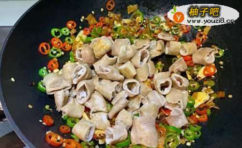 3锅热后干锅先炒肥肠去除水分后捞出备用