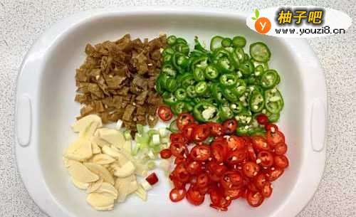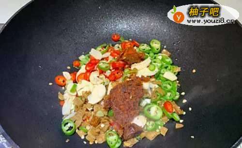 4锅热放入蒜片爆香后入三色辣椒炒香,再入麻辣锅底料酱炒匀
