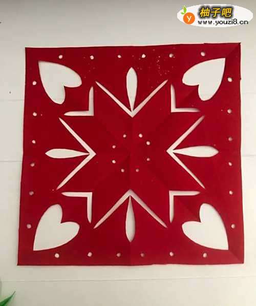 6第六步 剪完小圆点之后 再剪里面的每一个小图案 只需要把每一个小图案剪成镂空状即可 全部剪完之后 展开压平 一副简单漂亮的垫子小图案就裁剪完成了