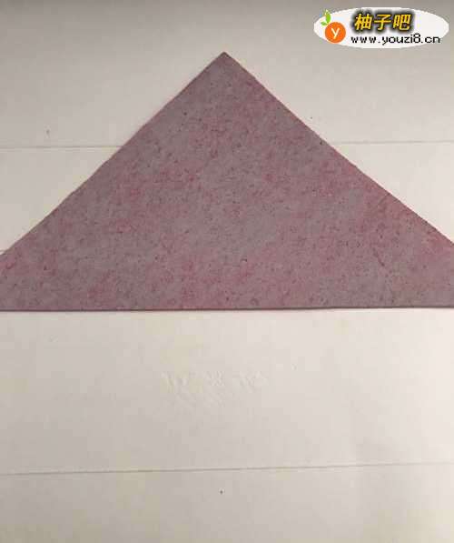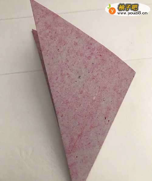 第一步 首先取一张16厘米长X16厘米宽的正方形红色彩纸 先把它从下向上对角折叠整齐