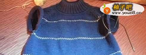 5紧接着,织26行后,再次提花。同时也分袖织身子。两边腋下各加8针,将身子连起来圈织。织到合适的尺寸,换12号针织衣边。织26行双螺纹后,收针。