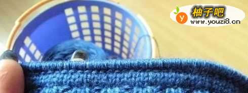 4之后,织了8行后,用白色线和蓝色线织两行提花,第一行一蓝一白,第二行一白一蓝。