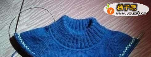 3随后,茎为5针,是因为我用小燕子加针法两边各两针平针,中间一针上针。先挑起54针,然后来回编织,每次来回挑织两针。一直挑织到前领还剩18针时,一次性挑起。这样领子就全部挑完了。(领子全部挑完时的背面和正面)