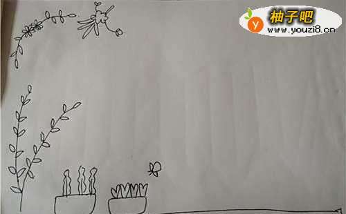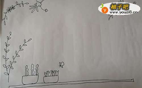 4画好后我们在最下面画上一根横杆,并在上面画上两个盆栽并在上面画上花草然后再画上一只蝴蝶。
