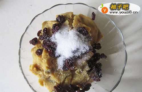 3随后在红薯泥中加入适量白糖,葡萄干拌匀
