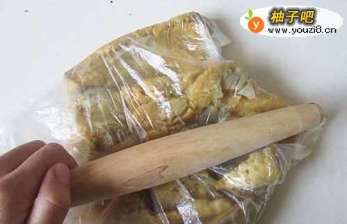2蒸熟的红薯块放入保鲜袋中用擀面杖或者玻璃瓶碾压成泥