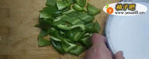 先把青椒清洗干净,再对半切开,去掉仔切成菱形块备用。